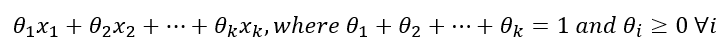 Convex set은 affine set에서 모든 $\theta$ 조건을 양수로 바꾸면 된다. 그러므로 affine combination이 두 점을 지나는 직선 형태로 표현되었다면, convex combination은 두 점을 지나는 선분 형태로, affine set이 두 점을 지나는 직선이 모두 포함된 집합을 표현했다면 convex set은 두 점을 지나는 선분이 모두 포함된 집합을 표현한다. Convex combination은 다음과 같이 정의할 수 있다.
