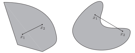 왼쪽의 집합은 집합 내의 어떤 점을 선택하든 연결하는 선분이 해당 집합 안에 포함되기 때문에 convex set이라고 할 수 있다. 이에 반해, 오른쪽 집합은 위 그림과 같이 $x_1$과 $x_2$를 선택하면 선분의 가운데 부분이 집합에 포함되지 않기 때문에 convex하지 않은 set이다.