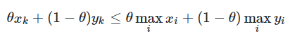 위 그림을 살펴보면, exponential 함수는 항상 두 점을 잇는 선분 위의 점이 함수보다 위에 있거나 같다. 또다른 예시로, max function이 있다. Max function이 convex function임은 다음과 같이 증명할 수 있다. 우선, 어떠한 $x_k$도 $max_{i}x_i$보다 더 클 수 없고, $y$의 경우에도 같기 때문에 다음 식이 만족된다.