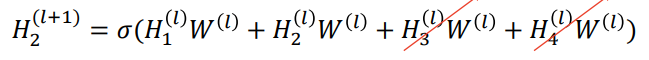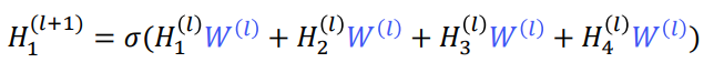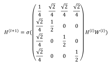 그러므로 위 GCN의 정의를 예시 그래프에 대해서 다시 쓰면 다음과 같다.