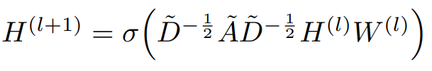 위 식에서 $H^{(l)}$은 $l$번째 hidden layer의 hidden state 행렬, $\tilde{A}$는 adjacency matrix에 identity matrix를 더한, self connection이 포함된 adjacency matrix, $\tilde{D}$는 degree matrix에 identity matrix를 더한 것, 그리고 $W$는 weight matrix를 의미한다. 위 식에서 앞의 $\tilde{D}^{-1/2}\tilde{A}\tilde{D}^{-1/2}$는 계산해보면 서로 노드가 연결되어 있거나 행과 열이 같을 때에만 값이 있고 나머지는 0인 행렬이고, H는 노드의 개수 X feature의 개수 행렬, W는 feature의 개수 X weight의 개수 행렬이다.