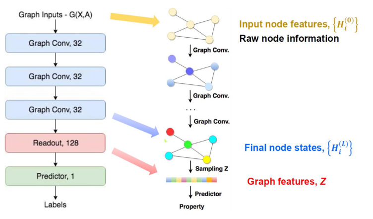 위 구조에서 Graph Conv는 위에서 설명했던 GCN이 hidden layer를 update했던 그 layer를 의미한다. 우리가 위 구조에서 눈여겨봐야할 점은 크게 두 가지이다. 첫 번째로, 그래프가 input으로 node feature와 함께 adjacency matrix를 함께 받는다는 것이다. 이를 통해 우리는, node feature만으로 표현할 수 없는 정보를 adjacency matrix를 통해 받게 되고, 이웃한 노드들끼리 비슷한 label을 가진다는 가정 아래에서 더 잘 작동하는 classification 모델을 얻게 된다. 두 번째로, readout이 permutation invariance를 지킬 수 있는 함수여야한다는 점이다. 노드의 순서가 바뀐다고 해서 노드들의 label이 바뀌면 안되기 때문에, permutation invariance를 지킬 수 있는 노드들 전체의 합 등을 readout으로 사용하게 된다. 이 readout은 graph 전체의 특성을 예측하는 graph classification 등에서만 사용된다.