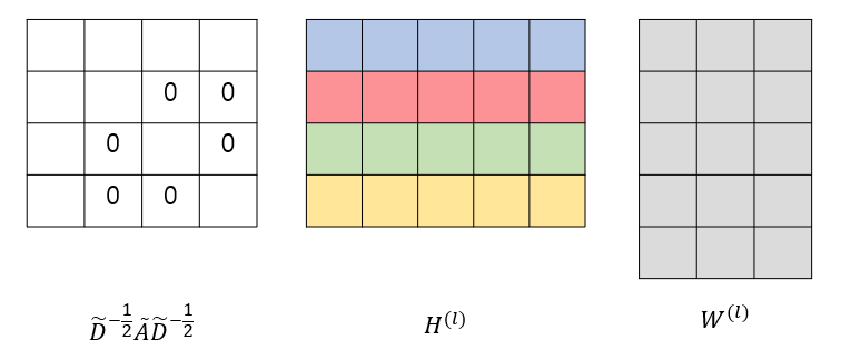 위 그래프의 feature 개수가 5, weight의 개수가 3이라고 할 때 GCN의 구조에 포함되는 행렬들은 아래 그림과 같은 구조를 가진다.