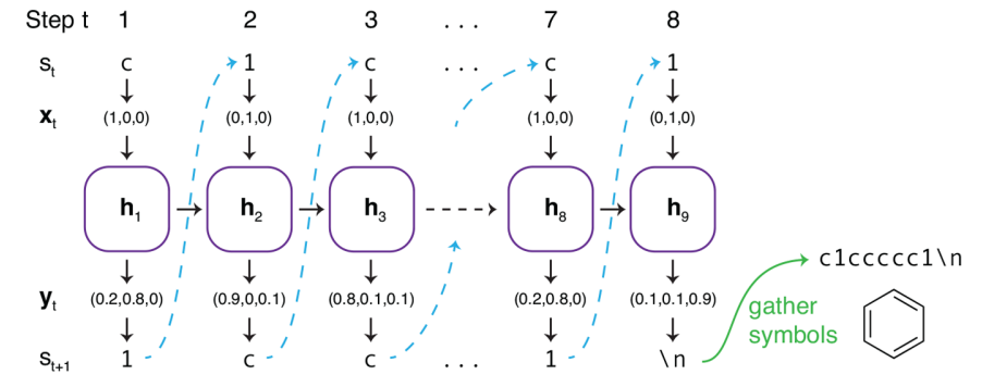 이 논문의 method 또한 아주 간단하다. 블로그 글로 써도 되는지에 대한 약간의 의문이 드는 정도.. 그래도 설명하면, CharRNN은 SMILES와 RNN을 활용하여 각 character를 하나씩 generate하는 모델이다. 이 논문에서는 RNN 중에서도 LSTM을 사용헀다. 이의 과정을 그림으로 표현하면 다음과 같다.