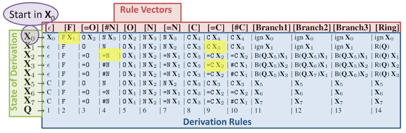 이러한 derivation rule을 따름으로써 validity를 항상 보장할 수 있는데, 이는 위의 derivation rule이 화학적으로 불가능한 결합은 generate할 수 없게 막아놓았기 때문이다. 만약 더 많은 분자들을 만들어내고 싶다면 적절한 derivation rule을 추가하면 된다.