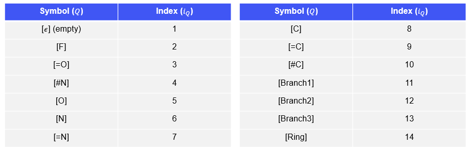 Branch는 [Branch1/2/3]이라는 문자 뒤에 branch의 길이를 나타내는 index symbol을 더한 형태로 표현된다. 즉, [Branch]Q는 현재의 브랜치 안에 $i_Q$개의 뒤에 오는 원자들이 포함된다는 의미이다. 다시 위에서 살펴봤던 분자를 보자.