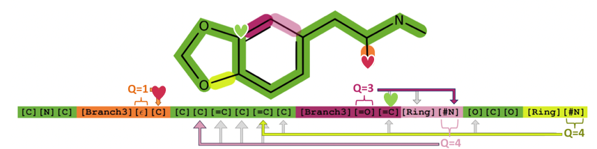 예를 들어, 우리가 지금 분홍색 [Ring][#N]이 어디에 어떤 원자가 이어져 있다는 것을 표시하는 것인지를 알고 싶다고 하자. 해당 ring의 현재 원자는 [Ring] 표시 바로 앞에 있는, 자주색 하트의 [=C]이다. 이 ring 표시는 뒤에 [#N]이라는 index symbol을 가지고 있기 때문에, 이에 해당하는 숫자 ($i_Q$)는 4이고, 그러므로 5개 앞의 원자와 연결되어야 한다. 이는 branch 표시들과 index symbol을 제외하고, C, =C, C, =C를 거쳐 다섯 번째 원자인 C에 연결된다. 즉, 이는 분자에서 분홍색 하트의 C와 연결되는 것이다.