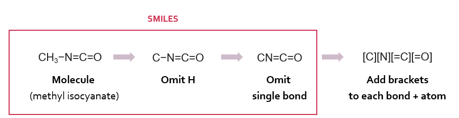 SELFIES의 원자와 결합은 결합+원자가 하나의 대괄호 안에 포함된 [결합+원자] 형태로 표현된다. 다른 규칙들은 SMILES와 동일하다. 예를 들어, 다음 그림과 같이 SMILES에서 CN=C=O 형태로 표현되는 methyl isocyanate 분자가 있다고 했을 때, 이를 SELFIES로 표현하면 [C][N][=C][=O]가 된다.