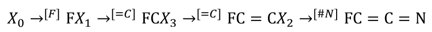 $X_0$라는 state에서 시작해서, 다음에 오는 string에 따라서 string을 만들어내는 형태이다. 위 식에서 $B(Q, X_n)$은 다음 Q개의 symbol들이 branch에 포함되는 것을 의미하고, $R(Q)$는 현재의 atom이 Q+1개 앞의 원자에 연결되는 것을 의미한다. 그리고 ign은 다음에 오는 character를 무시하라는 의미로, index symbol을 뜻한다. 예를 들어, [F][=C][=C][#N]라는 SELFIES string이 있다고 하자. 이는 다음과 같은 과정을 통해 SMILES string으로 변환될 수 있다.