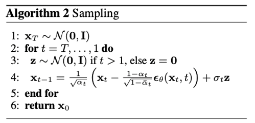 이렇게 위 과정을 통해서 $\mu_\theta$를 얻어내면, 이를 활용해서 우리는 $p_\theta(x_{t-1}|x_t)$로부터 $x_{t-1}$을 샘플링할 수 있다. 이 과정은 다음과 같은 알고리즘으로 표현할 수 있다.