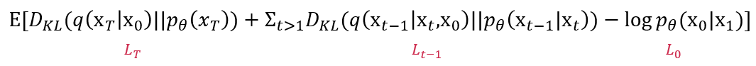 $L_T$에서 우리는 $q$와 $p(x_T)$를 각각 학습이 필요하지 않은 파라미터를 가지는 정규분포로 가정했기 때문에, 이를 최소화하기 위해서 우리가 학습해야하는 파라미터는 없다. 그러므로 학습하는 동안 이 loss는 무시가 가능하다.