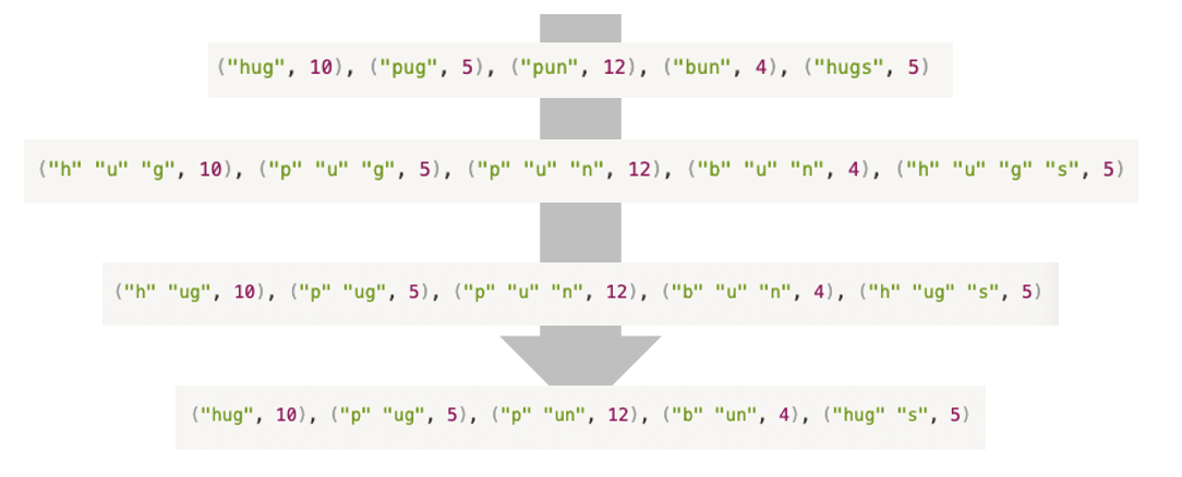 BPE 알고리즘은 기본적으로 문장이 pre-tokenize 되어 있다고 가정한다. 즉, 하나의 문장이 모두 이어져 있는 것이 아닌 띄어쓰기 등으로 분리되어 있다고 가정하는 것이다. 우리의 예시 문장이 "hug pug pun bun hugs"라고 하자. (아무런 뜻이 없는 그냥 예시 문장이다.) 그러면 이들 문장이 띄어쓰기 기준으로 pre-tokenize된다고 할 때, 우리는 "hug", "pug", "pun", "bun", "hugs"의 다섯 개의 단어들을 가지고 있는 것이다.