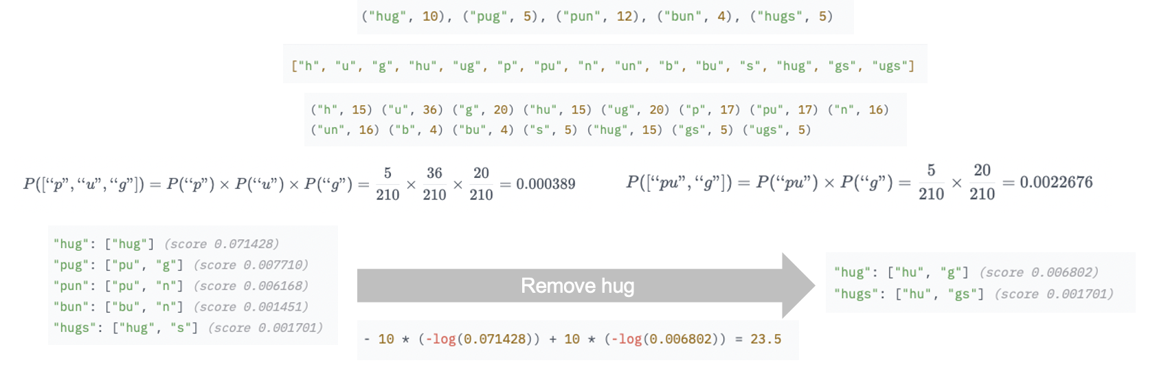 이렇게 pug에 대해 가능한 모든 tokenization인 p u g, pu g, p ug의 probability를 각각 구하면 다음과 같다.