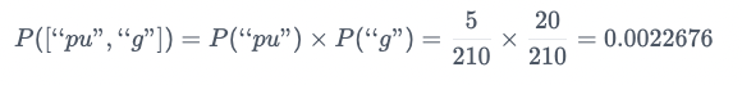4. 각 단어들에 대해 tokenization들의 probability를 계산한다. 이 때, 각 token 내의 character의 probability는 서로 독립이라고 가정한다. 예를 들어, pug라는 단어에 대해 각 tokenization 방법들의 probability를 구한다고 하자. 우선, p u g tokenization의 probability를 구해보자. 전체 token들의 빈도의 합을 구하면 210이 되고, p의 빈도는 17, u의 빈도는 36, g의 빈도는 20이기 때문에 이의 probability는 다음과 같다.
