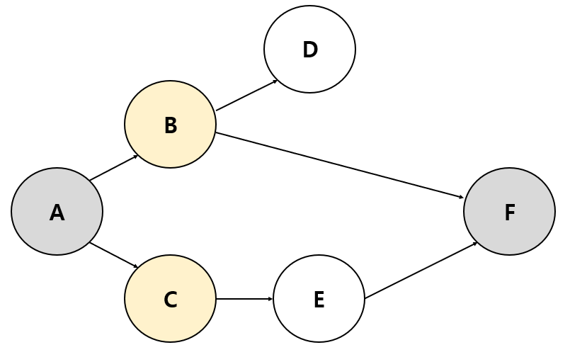 다른 하나의 예시로 우리는 B와 C가 A, F가 주어졌을 때 독립인지 ($B \indep C | A, F$)를 알고 싶다. 이를 위해서는 위에서 한 것과 똑같이 A, F가 주어졌을 때 B로부터 C까지 공을 굴릴 수 있는지를 알아보면 될 것이다. B는 공을 굴려 F까지 도달할 수 있고, C도 공을 굴려 E를 거쳐 F까지 도달할 수 있다. 이들은 V-structure의 가운데 노드인 F가 given이기 때문에 여기까지 공을 굴릴 수 있고, 서로 공이 만나게 되어 B와 C는 서로 독립이 아니게 된다.