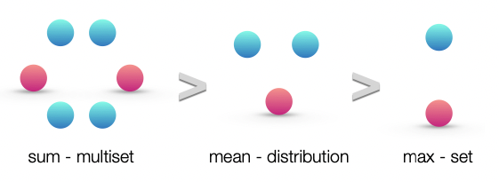 이들을 aggregate한다고 할 때, 아래 그림과 같이 sum은 mean이나 max보다 훨씬 뛰어난 expression power를 가질 것이다. 예를 들어, 노드의 feature를 one-hot vector로 표현한다고 하자. 우리의 예시에서는 파란색이 (1,0), 빨간색이 (0,1)이라고 하겠다. 그러면 sum은 어떤 노드의 개수가 input으로 들어오든 이들을 모두 구별할 수 있을 것이다. 하지만 mean은 (파란색 4개, 빨간색 2개)가 들어오든 (파란색 2개, 빨간색 1개)가 들어오든, 심지어는 (파란색 100개, 빨간색 50개)가 들어오든 모두 같은 embedding으로 매핑할 것이다. 또한 max는 더 심하게 빨간색과 파란색이 포함되어 있기만 하면 이들을 모두 같은 embedding으로 매핑할 것이다. 그러므로 우리는 sum이 mean, max에 비해 가장 강한 expression power를 가짐을 알 수 있다.