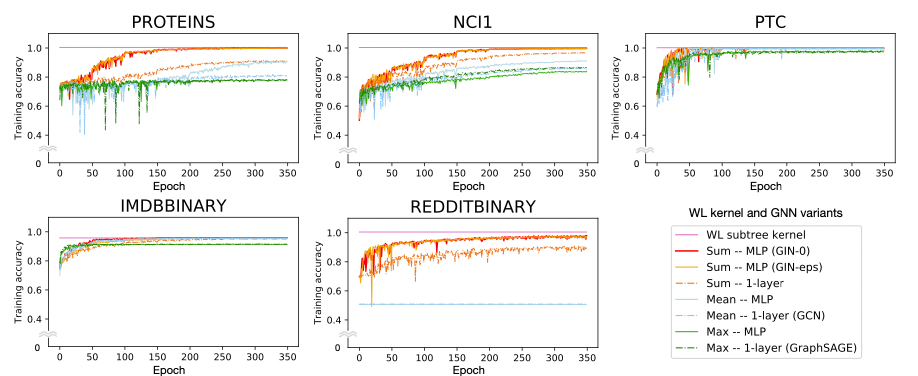 이 연구에서는 GIN의 성능을 graph classification 실험을 통해서 측정하였다. 그 결과는 다음과 같다. Y축이 accuracy이기 때문에 더 위에 있을수록 성능이 좋은데, GIN이 WL subtree kernel만큼은 아니지만 학습을 거듭할수록 그에 준하는 결과를 보여줌을 알 수 있다.