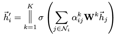 최종적인 각 노드의 feature는 위에서 얻은 attention coefficient를 활용하여 다음과 같이 표현된다. 즉, 이웃한 모든 노드들에 대한 attention 값을 각 이웃 노드의 hidden vector에 곱하여 이들을 더하고, 이를 non-linear function에 넣어주는 것이다.
