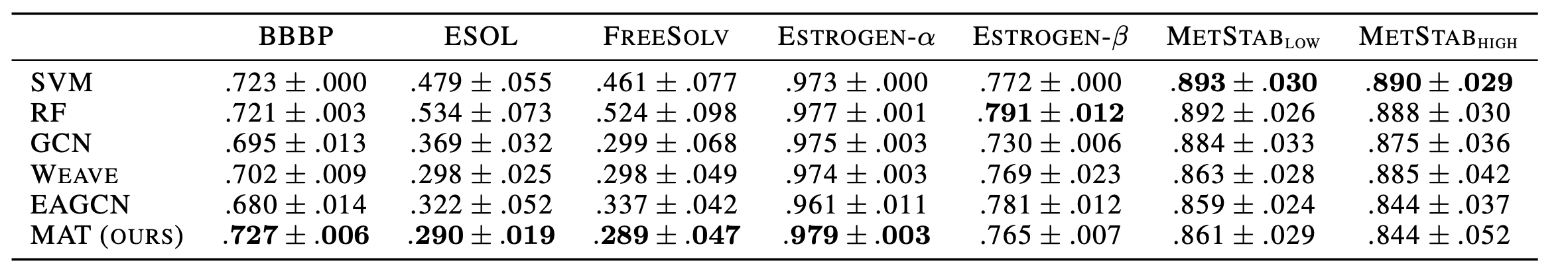 MAT의 성능은 molecule property prediction을 통해 측정되었다. 아래 표에서 리포트하는 값은 ROC AUC로 값이 높을 수록 더 성능이 좋은 것이다. 아래 표를 통해 우리는 MAT가 molecule property prediction에서 좋은 성능을 보였음을 알 수 있다.