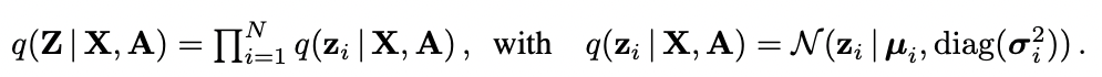 Encoder는 그래프를 latent variable의 probability distribution으로 매핑한다. 이를 간단한 문제로 만들기 위해서 probability distribution은 VAE와 마찬가지로 정규분포로 정의하고, 이 정규분포의 평균과 분산을 모델링한다. 이를 식으로 나타내면 다음과 같다.