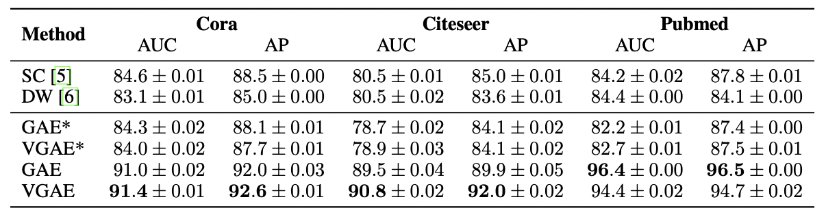 GAE와 VGAE가 잘 작동하는지는 각 노드 사이에 엣지가 존재하는지를 예측하는 link prediction task에 대해서 평가한다. 아래 표에서 GAE*와 VGAE*는 node feature 없이 학습을 진행한 결과이다. Node feature가 없을 때도 competitive한 결과를 보여주지만, node feature를 넣음으로써 더 좋은 성능을 보여주는 것을 알 수 있다.