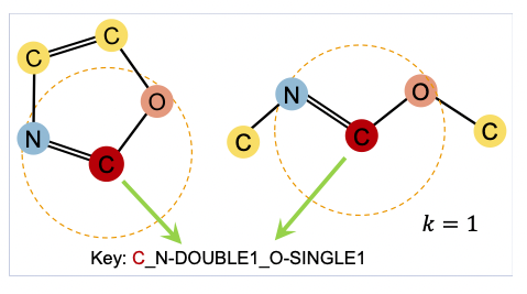 우리의 타겟 노드가 빨간색 C 노드라고 하자. 이 노드의 hop=1 (직접적으로 이웃한 노드) contextual property는 이중결합으로 연결된 파란색 N, 단일결합으로 연결된 주황색 O이기 때문에 이는 C_N-DOUBLE1_O-SINGLE1으로 표현된다. 이렇게 모든 노드들에 대해서 contextual property를 계산한 후, 각 노드를 masking하고 이에 해당하는 contextual property를 예측하는 것이 contextual property prediction이다.