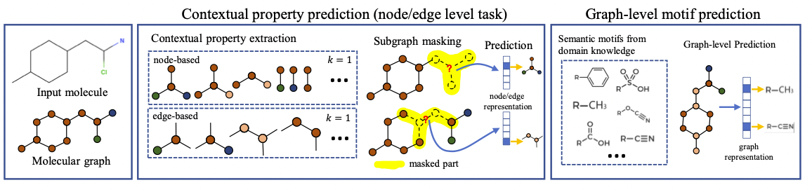 GROVER의 self-supervised task는 1) 노드와 엣지 단계에서의 contextual property prediction과 2) 그래프 전체 단계에서의 graph-level motif prediction으로 나누어진다.
