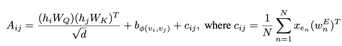 Edge encoding은 edge feature를 반영하는 encoding이다. Transformer에 edge feature를 반영하기 위해 Graphormer는 spatial encoding에서 정의한 similarity matrix에 edge feature를 추가한다. 즉, 노드 i로부터 노드 j로까지의 shortest path에 있는 모든 엣지들의 edge feature를 평균내어서 해당 matrix에 더하는 것이다. 이는 식으로 나타내면 다음과 같다. 아래 식에서 $c_{ij}$는 edge encoding을, $x_{e_n}$는 edge feature를 의미한다.