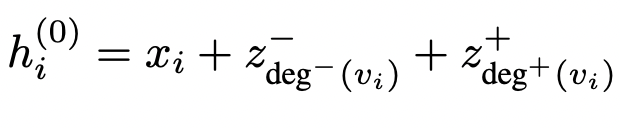 Centrality encoding은 각 노드의 중요성 정보를 반영하는 encoding으로, 그래프 내에서 각 노드가 얼마나 중요한 역할을 하는지를 의미한다. 많은 centrality measure들 중 Graphormer는 degree cnetrality를 사용한다. Degree centrality는 in-degree와 out-degree를 각각 다른 learnable embedding으로 학습하여 기존의 node feature에 더하는 식으로 계산된다. Degree centrality를 반영한 각 노드의 hidden vector 값은 다음과 같이 계산된다.
