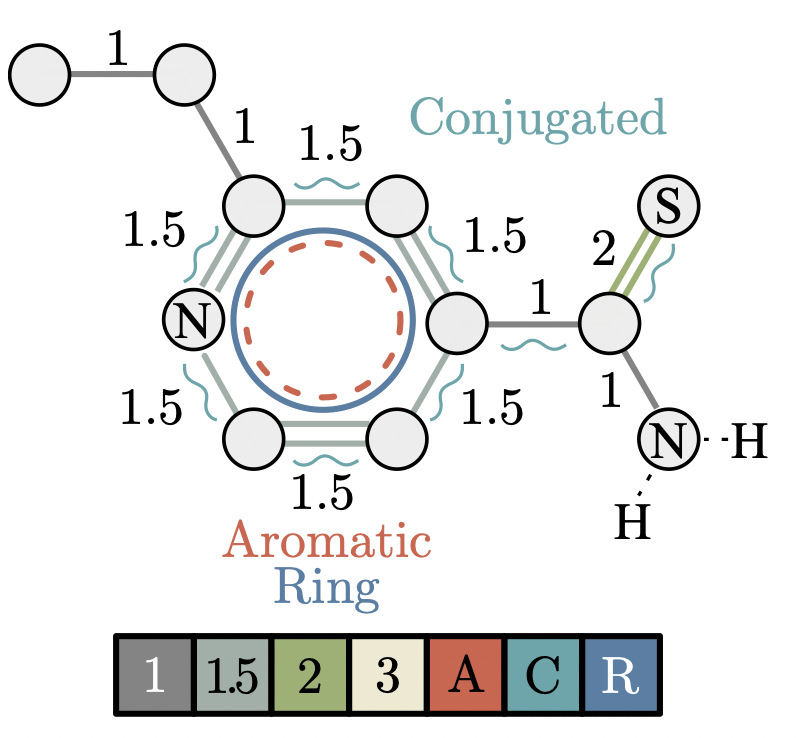 Bond embedding은 노드와 노드 사이에 존재하는 엣지의 엣지 타입을 의미한다. 이 엣지 타입에는 단일/이중/삼중 결합 등의 결합의 종류 뿐만 아니라 해당 엣지가 aromatic bond인지 등의 엣지의 특성들도 반영되어 있다. 이 때, 노드와 노드 사이에 결합이 존재하지 않으면 이 bond embedding은 아무런 값을 가지지 않는 0 벡터가 된다.