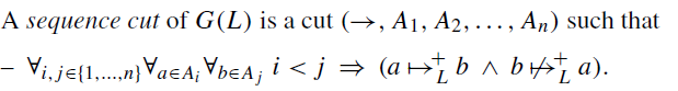 Exclusive-Choice Cut이 없다면 다음으로는 Sequence Cut을 찾는다. Sequence Cut은 각 Partition 사이에서 한 방향으로만 화살표가 있는 것을 의미한다. 아래 그림에서, 시그마1에서는 다른 partition으로 나가는 방향의 화살표만 있고, 빨간 엑스에 해당하는 1로 들어가는 방향의 화살표는 없다. 이러한 경우에 이를 sequence cut이라고 할 수 있다.