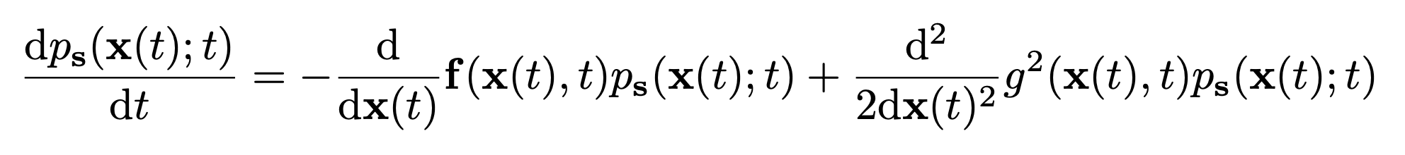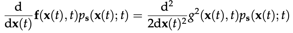 Fokker-Planck equation은 다음과 같은 식으로 표현된다. 아래 식에서 $p_s(\mathbf{x}(t);t)$는 어떤 확률 분포를 의미하고, generative model의 목적은 이 확률 분포의 stationary distribution이 data distribution으로 수렴하는 적절한 f와 g를 찾는 것이다.