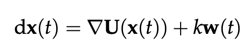이제 이 Langevin equation을 활용해서 어떻게 샘플링을 할 수 있는지에 대해 알아보겠다. 우리가 $\Delta U(x(t))$ 대신에 probability distribution의 미분, 즉 score function에서 2를 나눈 값을 대입하고, k를 1로 놓는다고 하자. 그러면 우리는 다음과 같은 Langevin equation을 얻을 수 있다.