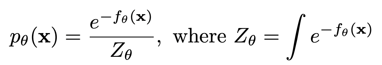 만약 우리가 probability density function p(x)를 다음과 같이 $\theta$로 parameterize된 energy-based model 형태로 정의한다고 하자.