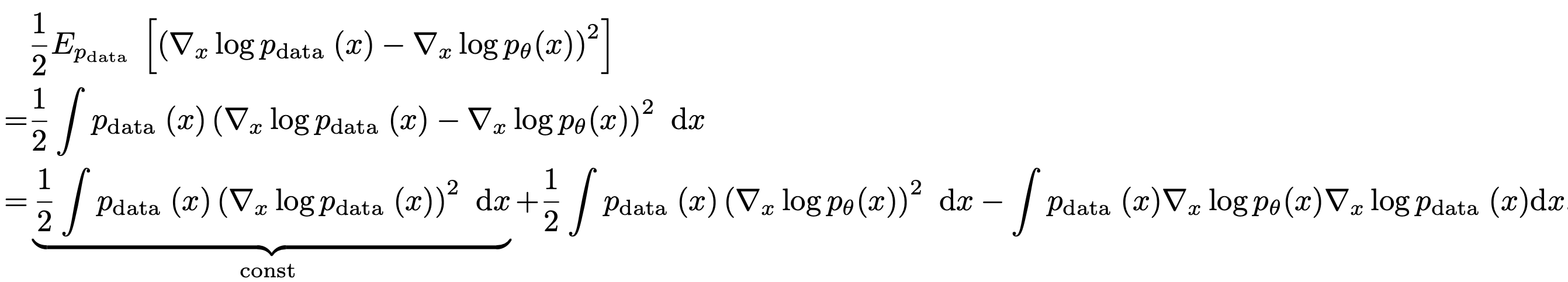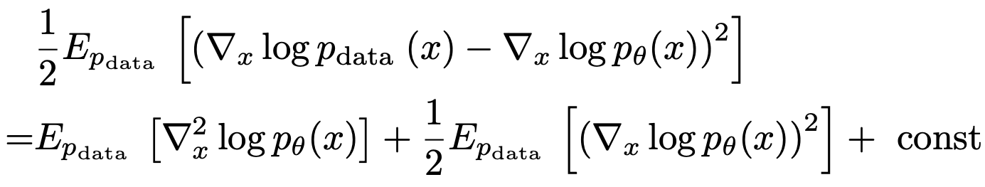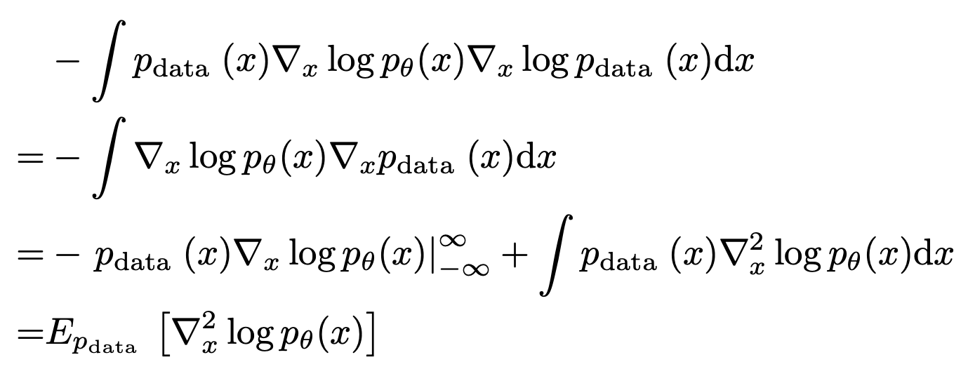 하지만 우리는 true data distribution을 정확하게 알지 못하기 때문에 위 형태의 loss는 사용하는 것이 현실적으로 불가능하다. 그렇기 때문에 score matching을 할 때에는 부분적분을 활용하여 위 식을 다음과 같은 형태로 좀 더 쉽게 만들어준다. 이 식은 우리가 추정하는 score function에만 의존하기 때문에 위 Fischer divergence보다 좀 더 쉬운 계산이 가능하다.