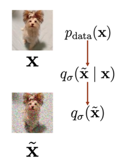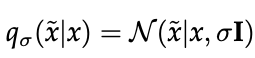 우선, 우리가 학습을 목적으로 하는 noise perturbed distribution은 다음과 같이 정의할 수 있다. 즉, 어떤 데이터 $x$가 주어졌을 때, 이것의 perturbed 데이터인 $\tilde{x}$의 분포를 학습하는 것이다.