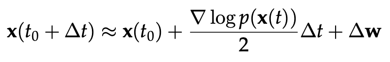 Langevin dynamics는 score matching에서 구한 score function을 활용하여 데이터를 샘플링(혹은 생성)하는 방법이다. 가장 간단한 방법으로, 아래와 같은 식의 Euler-Maruyama method를 활용하여 샘플링이 가능하다.