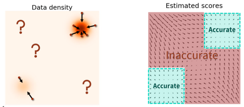 기존의 아주 간단한 형태의 score-based 생성 모델은 위에서 설명한 score matching 식을 활용하여 학습을 진행하고, 이를 통해 학습한 score function을 Langevin dynamics 식에 넣음으로써 샘플링을 진행해왔다. 하지만 이러한 방법들은 몇 개의 한계점을 가진다.