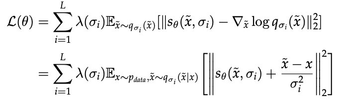 여기에서 weight $\lambda$는 보통 $\sigma$의 제곱으로 정의되는데, 이는 score network가 실험적으로 $1/\sigma$에 비례하기 때문에 이를 보정하기 위해서이다.