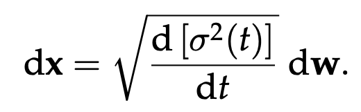 이를 표현하는 forward SDE는 다음과 같은 형태로 정의된다. 이 식은 위의 NCSN과 반대로, t가 증가함에 따라 x(t)의 variance가 점정 증가하는 것이 아닌, 어떤 값에 bound되는 특성을 가진다. 그래서 우리는 이 DDPM을 위한 forward SDE를 variance-preserving SDE라고 부른다.