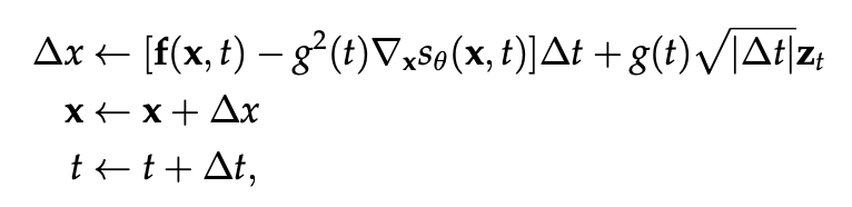 SDE solver로는 어떤 형태의 것이든 활용될 수 있다. 예를 들어, Euler-Maruyama method를 활용해 위 reverse SDE를 푼다고 하자. 그러면 다음과 같은 형태로 x와 t를 계속 업데이트하면서 식을 풀 수 있다.