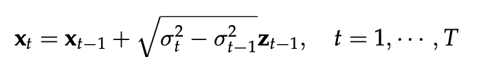 먼저, NCSN의 forward process는 점점 더 커지는 variance를 가지는 noise perturbation process를 가진다. 이는 다음과 같은 식으로 표현할 수 있다.