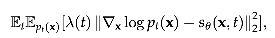 이 때, 어떠한 forward SDE도 위 식과 같은 reverse SDE 형태를 가지기 때문에, 우리는 forward process를 나타내는 SDE만 정의하면 이를 활용해 샘플을 생성하는 reverse SDE는 쉽게 정의할 수 있다. 위 식에서 dt는 SDE와는 반대로 시간을 역행하는 negative infinitesimal time step을 의미하고, $\nabla_x \log p_t(x)$는 log probability의 gradient를 의미하는 score function이다. 그렇기 때문에 score matching에서 간단하게 살펴봤던 것처럼 이 (time-dependent) score function만 학습하면, 우리는 데이터를 생성하는 reverse SDE를 얻을 수 있게 된다. 이는 다음과 같이 표현된다.