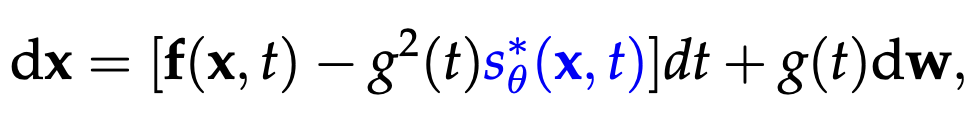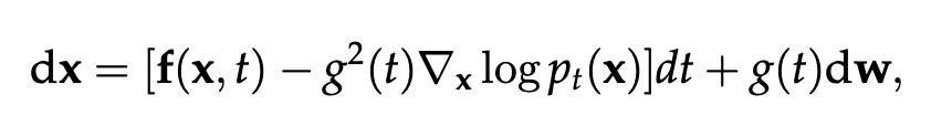 다음으로, 샘플을 generate하는 reverse process는 다음과 같은 SDE 형태로 표현된다.