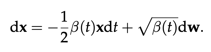 이 식은 가장 기본적인 SDE 형태 중 하나로, 간단하게 설명하면 f(x,t)는 시간이 흐름에 따라 식이 전반적으로 어떻게 변하는지를 표현하는 drift coefficient, dt는 infinitesimal time step, g(t)는 diffusion coefficient, w는 randomness를 표현하는Wiener process를 의미한다.