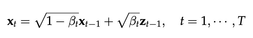 다음으로, DDPM의 forward process는 다음과 같은 형태로 정의된다.
