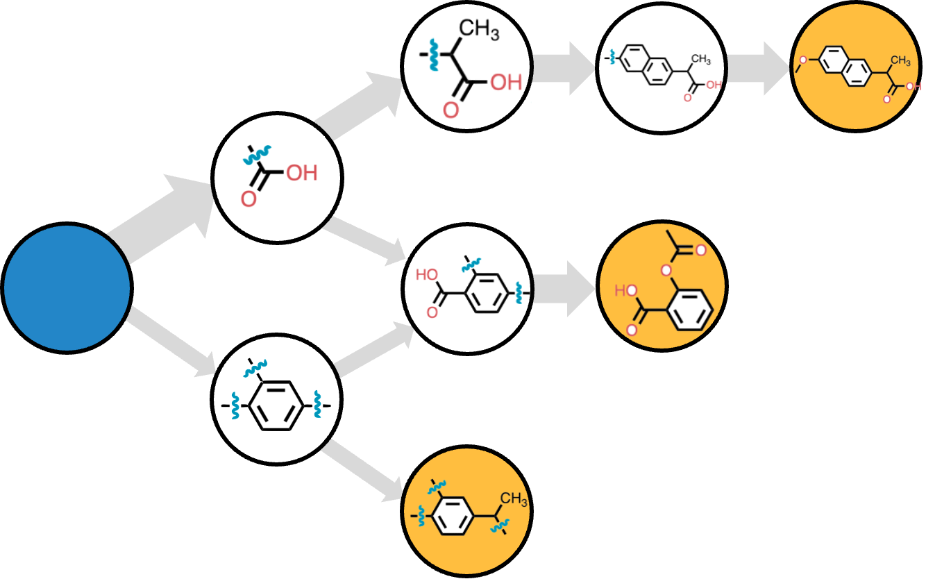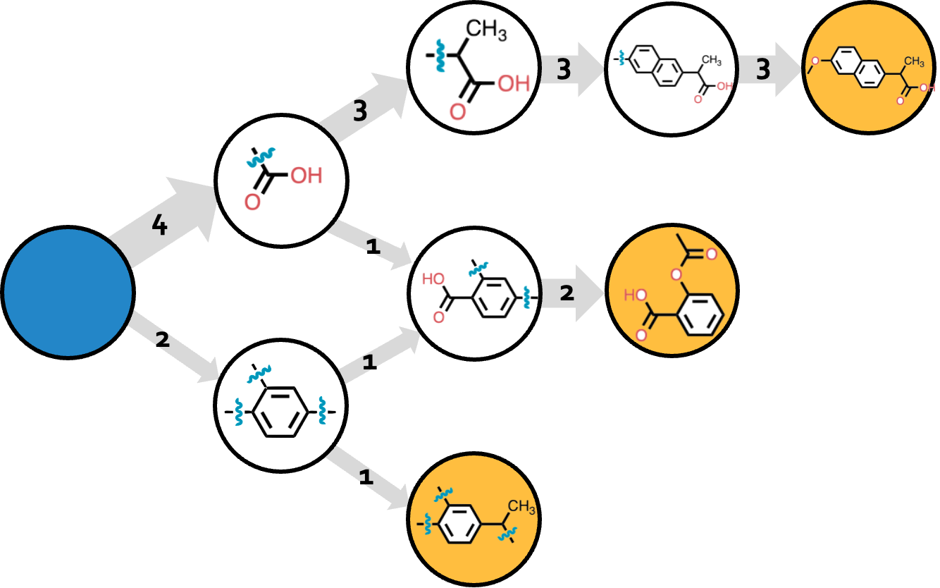 위 그림에서 각 동그라미는 state, 이들을 연결하는 화살표는 action 혹은 state transition이라고 부른다. State는 어떤 compositional object, 즉 어떤 작은 component들이 합쳐진 object를 의미하고, 위 그림에서는 각 분자 구조 혹은 분자 구조의 subgraph가 된다. 또한 이러한 state는 파란색으로 표현된 처음의 initial state, 흰색으로 표현된 intermediate state, 그리고 노란색으로 표현된 최종 생성 샘플에 해당하는 terminal state로 이루어진다. Action은 이 state들 간의 연결을 의미하고, 보통의 경우 component를 더하는 것을 의미한다. 위 그림에서는 어떤 subgraph 혹은 fragment를 더하는 과정이 될 것이다.