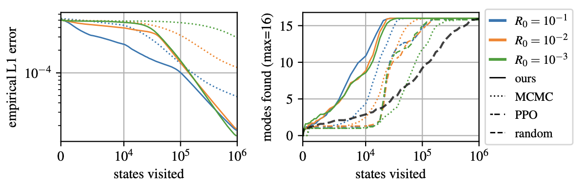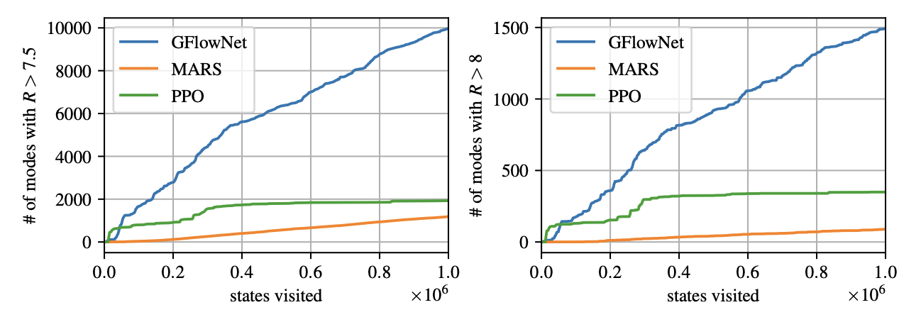 GFlowNet은 다음과 같이 synthetic한 hyper-grid에서 reward가 높은 state를 찾는 task나 practical한 molecule generation과 같은 task에서 모두 좋은 성능을 보였다. 특히, 강화학습 방법들과 비교했을 때 어떤 reward를 만족하는 diverse한 solution들을 생성하는 데에 좋은 효과를 보였다.