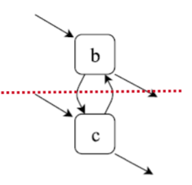 여기서 cut을 다시 찾는다. XOR cut이 있는가? 없다. sequence cut이 있는가? 없다. parallel cut이 있는가? 이 말은 위에서도 말했지만, 나누었을 때 각 partition에 start와 end activity가 모두 포함되고, 각 element들이 모두 양방향으로 연결되어 있는가? 라는 의미이다. b, c를 나누었을 때 조건을 만족하는 것을 알 수 있다. 있다!