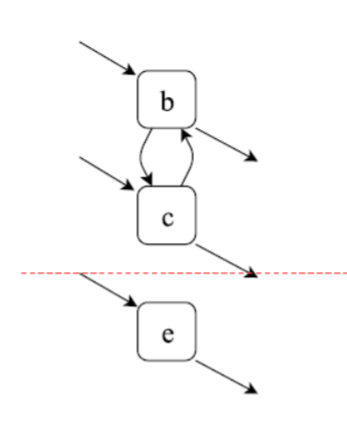 sequence cut이 있는가? 즉, 한 방향으로만 가는 액티비티가 있는가? 있다. a를 partition 1이라고 하고, d를 partition 2, 나머지를 partition 3이라고 하면, partiiton 1에서는 partition 3으로 가기만 하고, 반대 방향의 연결은 없고, partition 3에서는 partition 2로 가기만 하고, 반대 방향의 연결이 없다. 저 곳을 잘라 준다.